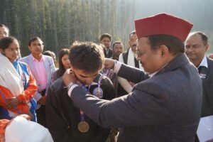 खिलाड़ियों को पदक पहनाते मुख्य सचिव आनंदबर्द्धन