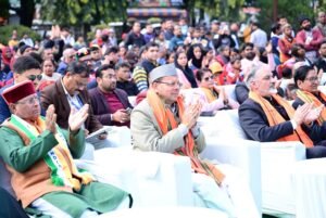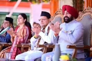 परेड मैदान पर गणतन्त्र दिवस के मुख्य समारोह के दौरान तालियाँ बजा कर कलाकारों-परेड में शामिल जवानों का हौसला बढ़ाते राज्यपाल गुरमीत सिंह,CM पुष्कर सिंह धामी और उनकी पत्नी गीता,BJP प्रदेश अध्यक्ष महेंद्र भट्ट