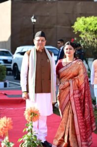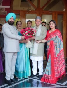 राज्यपाल गुरमीत सिंह और मुख्यमंत्री पुष्कर सिंह धामी गुलदस्तों का आदान-प्रदान करते हुए