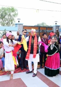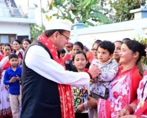 अलग-अलग समुदाय की महिलाओं ने हिंदी, कुमाऊंनी, थारू एवं बंगाली लोक परंपराओं पर आधारित होली गीतों और सांस्कृतिक प्रस्तुतियों से नगला तराई स्थित मुख्यमंत्री के घर आँगन में होली का समां बांध दिया। मुख्यमंत्री खुद को झूमने और लोगों संग थिरकने से रोकने में नाकाम हुए और उनके कदम भी खुद बा खुद संगीत और गाने की धुन कानों में पड़ते ही होल्यारों संग उठ पड़े। वह काफी देर तक सभी के साथ ताल मिला के नाचे। इससे पहले उन्होंने माँ और बहन से रंग-गुलाल लगवाया। उनको भी रंग लगाया। चरण स्पर्श किए।