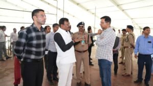 महेंद्र ग्राउंड पर PM Visit तैयारियों का जायजा लेने के दौरान सचिव डॉ पंकज पांडे,DM सविन बंसल और IGP राजीव स्वरूप को निर्देश देते CS आनंदबर्द्धन (नीचे)