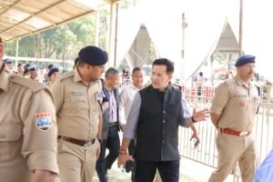 DGP दीपम सेठ (सूट में)महेंद्र ग्राउंड पर SSP प्रमेन्द्र डोभाल को निर्देश देते हुए